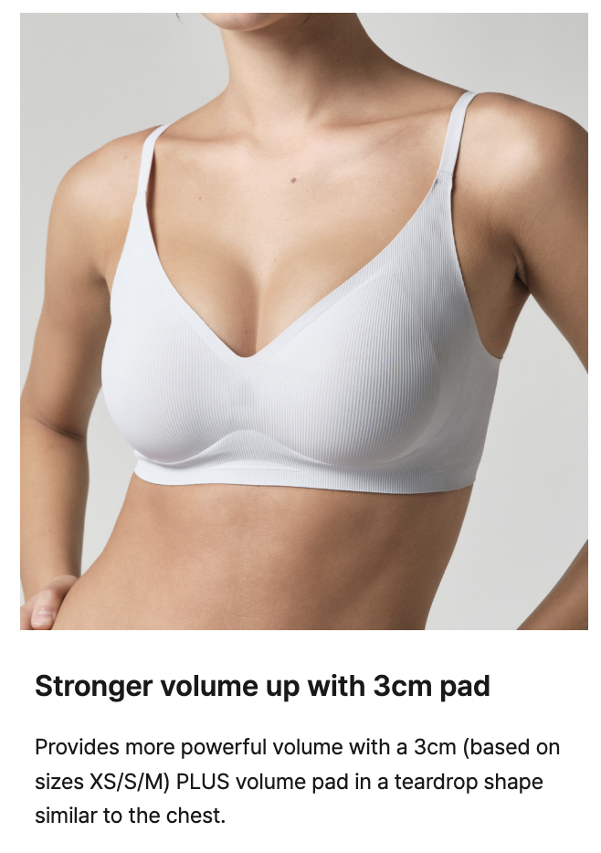 Created for those seeking both undeniable volume and unparalleled comfort, the Cool Fit Bra Volume Fit PLUS retains the original Volume Fit's comfort while offering a more pronounced silhouette with its 3cm-thick PLUS volume pads. Enjoy a feminine mood and lasting volume all day long.